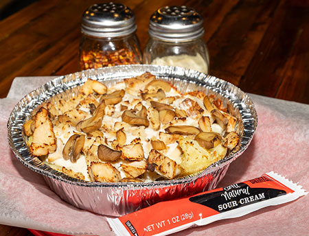Baked Potato Topped With Butter, Chicken, Mushrooms, Cheese, And Alfredo Sauce.