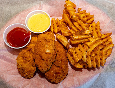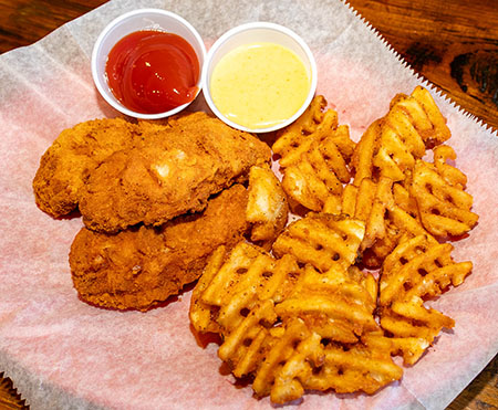 Chicken Tenders service with waffle fries and your choice of dipping sauce.